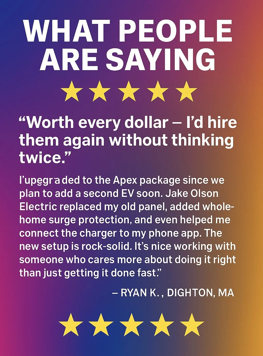 Rebates, credits, and incentives are subject to eligibility, program requirements, utility provider rules, and individual circumstances. While most Massachusetts homeowners qualify for available EV charging incentives, amounts and availability may vary and are not guaranteed. Federal tax credits are subject to IRS rules and the homeowner’s personal tax situation.PowerBill credits are issued at completion of installation and intended to be applied toward a future electric bill. Rebate and incentive assistance includes paperwork support but does not guarantee approval or payout by third-party programs.Pricing reflects standard residential installations and may vary based on site conditions, electrical system configuration, accessibility, material requirements, and distance. Installations requiring extended conduit or wiring runs beyond 100 feet, structural obstacles, or non-standard routing may result in additional cost.EV charging equipment is not included unless explicitly stated. Installation timelines and scheduling are subject to availability.Any references to savings, return on investment, or cost recovery are estimates based on typical usage patterns and should not be interpreted as guaranteed financial outcomes.All work is performed by a licensed and insured electrician in accordance with applicable codes and standards.
